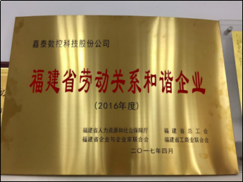 | 嘉泰數控:被授予“福建省勞動關系和諧企業(yè)”榮譽稱號 |