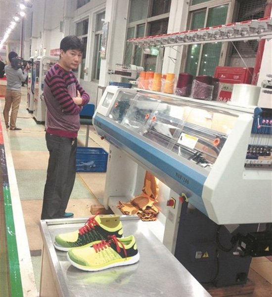 智能化鞋面橫機(jī)一次編織成型生產(chǎn)效率是人工的5倍 采用傳統(tǒng)的鞋面生產(chǎn)工藝作業(yè),人均每小時生產(chǎn)3雙鞋面,而一體鞋面機(jī)平均每小時的產(chǎn)量為15雙,這就是飛藝織造公司剛剛買進(jìn)的野馬牌3D智能化針織鞋面橫機(jī)的“威力”。 這款由南安市南星工業(yè)機(jī)械有限公司投入批量生產(chǎn)的“數(shù)控一代”產(chǎn)品,顛覆傳統(tǒng)鞋面生產(chǎn)工藝,拋棄了傳統(tǒng)鞋面工藝的大量裁剪縫合工序,鞋面一次整體編織成型,同時可節(jié)約大量邊角廢料和勞動力。 安上四錠不同顏色的紗線,開啟機(jī)器,“噠噠噠”,不一會兒,一張張成型的彩色鞋面就源源不斷地“吐”出來,昨日記者親眼目睹了野馬牌3D智能化針織鞋面橫機(jī)的“魔力”。現(xiàn)場技術(shù)人員拿起一組鞋面,捏一捏,告訴記者:“你瞧,很輕便、透氣、舒適,可以根據(jù)要求個性定做,迎合目前時尚新穎的消費潮流?!?br /> 據(jù)南星公司相關(guān)負(fù)責(zé)人張明介紹,經(jīng)過為時一年的研發(fā),野馬牌鞋面橫機(jī)已完成定型并交付客戶使用,公司摸索出一套完整成熟的鞋面打版、編織、后整工藝,可為客戶提供有力的技術(shù)支持。據(jù)介紹,這臺新設(shè)備實現(xiàn)多項技術(shù)創(chuàng)新,比如,成型設(shè)定支持鞋面特性工藝,直觀、快速地生成制版系統(tǒng)鞋面花樣;花樣解譯自動優(yōu)化,可以自動分析機(jī)器參數(shù),對花樣編織優(yōu)化處理,縮短編織時間;通過擁有專利技術(shù)的升降式沉降片控制,能夠根據(jù)編織需要,精準(zhǔn)控制沉降片工作的力度,良好輔助脫圈;而快速回轉(zhuǎn)技術(shù)的應(yīng)用,輕便的6英寸機(jī)頭配合快速回轉(zhuǎn)功能,可以使效率提高10%以上。 “用戶使用我們的專用打版軟件設(shè)計鞋面花型,機(jī)器根據(jù)花型程序自動完成鞋面編織,自動化程度高,一人可同時操作10臺機(jī)器?!睆埫髡f,已經(jīng)與泉州飛藝織造公司簽訂100臺訂單,預(yù)計今后可完成年產(chǎn)400臺以上的生產(chǎn)規(guī)模。這款設(shè)備價格僅為同類進(jìn)口機(jī)器的三分之一,而跟國內(nèi)同類型機(jī)器相比,野馬機(jī)具有運轉(zhuǎn)速度快、功能豐富、編織穩(wěn)定的特點。
