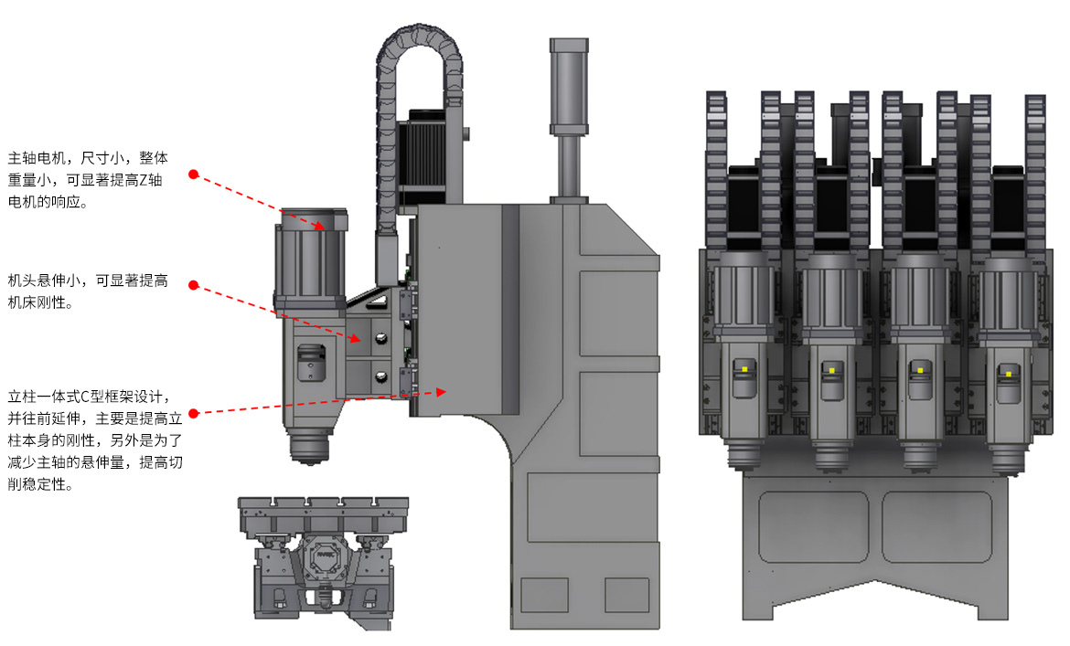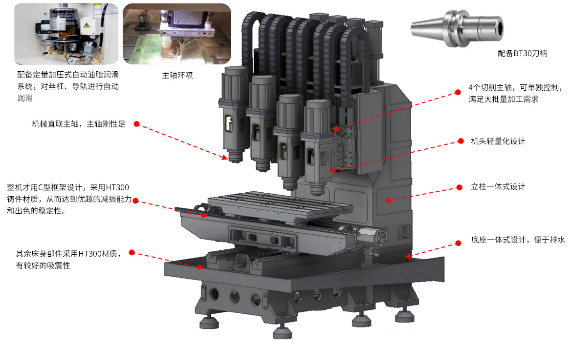 該系列產(chǎn)品主要針對2.5D、3D玻璃、的大面開粗加工,以及外輪廓加工,4個切削主軸設計,多通道可單獨控制主軸升降,并采用直聯(lián)機械主軸設計,主軸切削扭矩大,對于玻璃等脆硬材料的粗加工有很大優(yōu)勢。